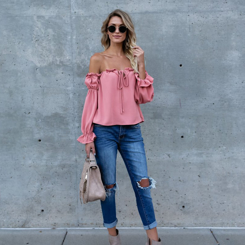 Top de mujer informal de gasa con hombros descubiertos y color liso