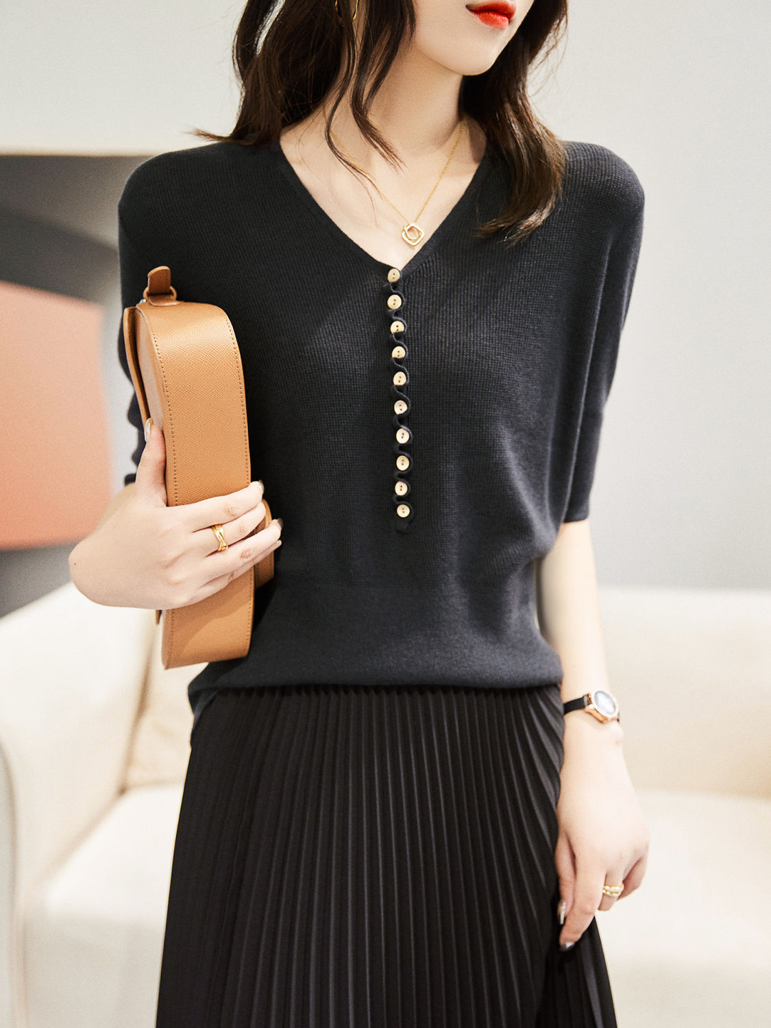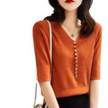 Camiseta de punto de manga tres cuartos holgada y moderna para mujer